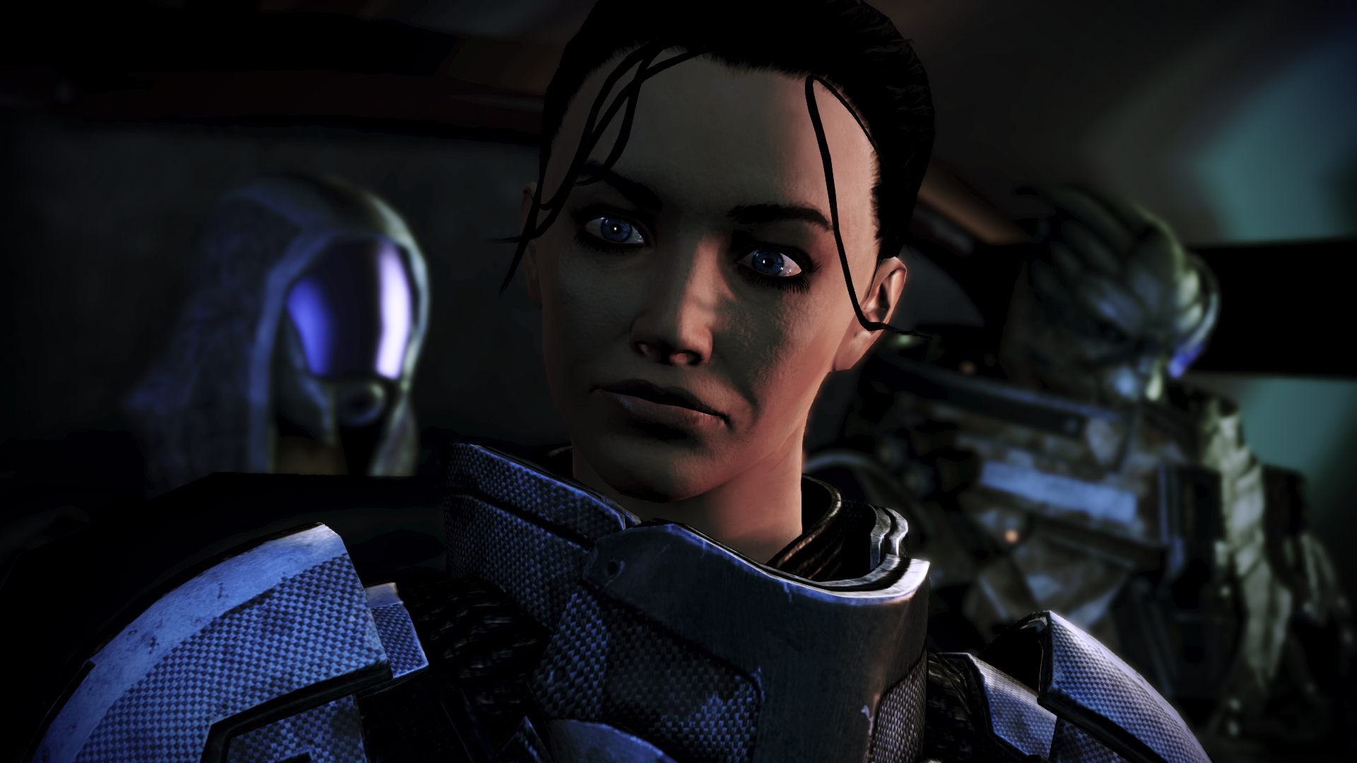 Tali, Shepard i Garrus.